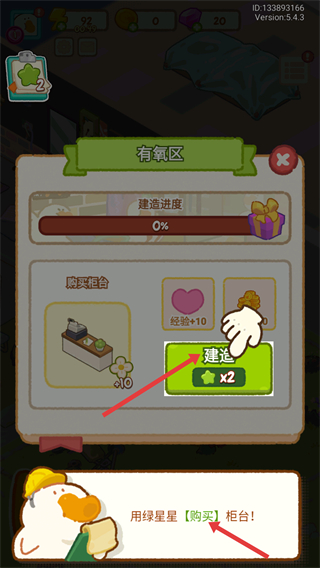4、使用綠星星購(gòu)買(mǎi)柜臺(tái),點(diǎn)擊建造按鈕可完成柜臺(tái)建造,提升有氧區(qū)建造進(jìn)度,持續(xù)建設(shè)健身房。