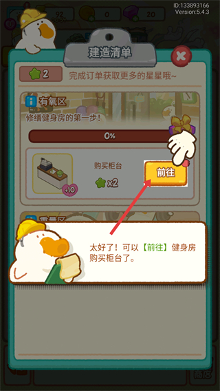 3、在建造清單界面,點(diǎn)擊前往按鈕可購(gòu)買(mǎi)柜臺(tái),推進(jìn)有氧區(qū)等區(qū)域的建設(shè),完善健身房設(shè)施。
