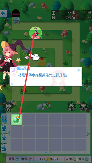 2、能將經(jīng)驗(yàn)藥水拖至英雄處,對英雄進(jìn)行升級,提升英雄的能力,助力戰(zhàn)斗更好地進(jìn)行。