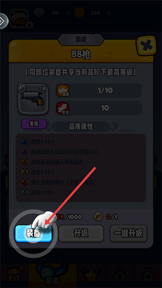 4、可裝備武器如BB槍,提升攻擊等屬性,點(diǎn)擊裝備按鈕穿戴,不斷強(qiáng)化裝備,增強(qiáng)角色實(shí)力。