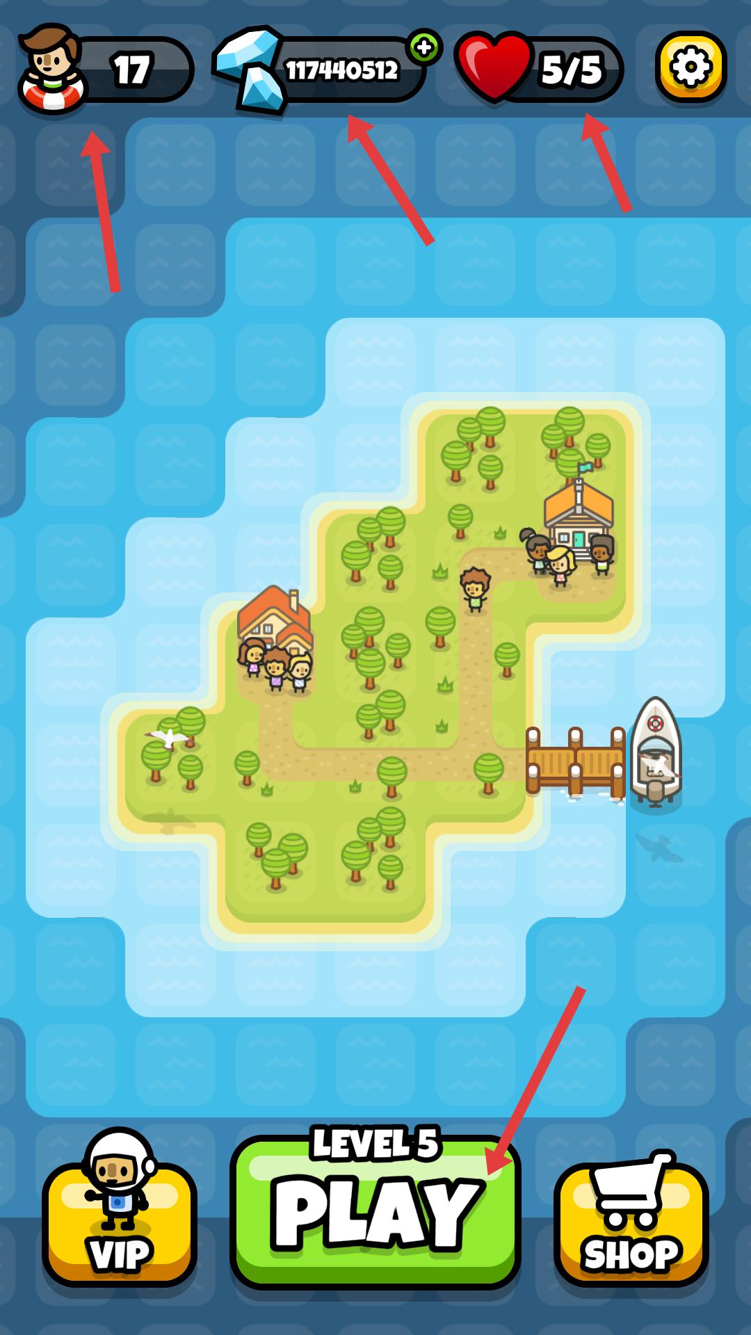 1、游戲主界面,上方顯示等級、鉆石、愛心等信息,下方有VIP,PLAY,SHOP按鈕,點擊綠色PLAY按鈕,即可進入游戲。