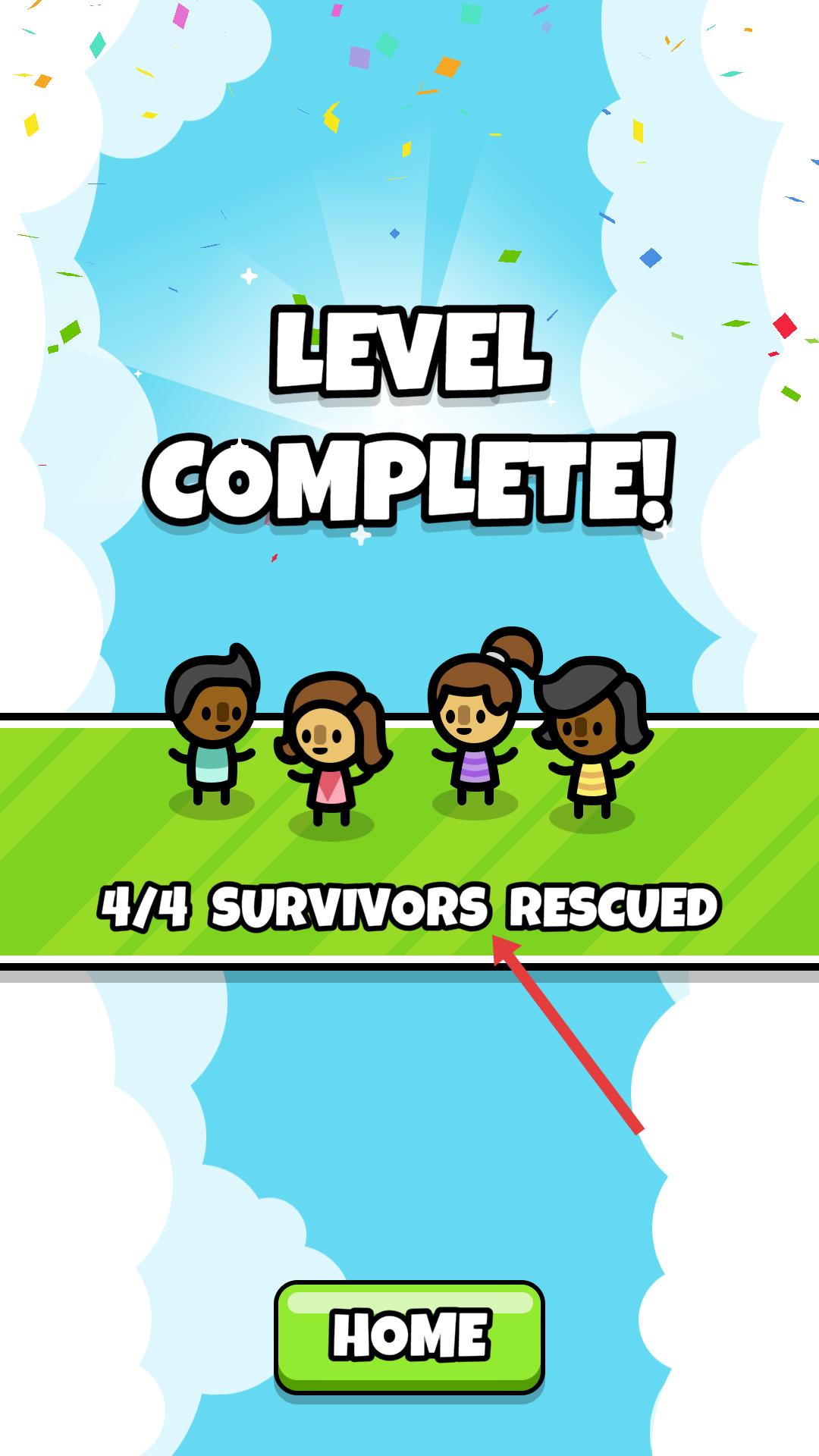 4、成功營救4名幸存者后,會顯示關(guān)卡完成,此時可點擊HOME按鈕,返回主界面,繼續(xù)后續(xù)游戲或選擇其他關(guān)卡。