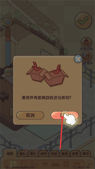 4、回收家具時,會彈出是否將所有家具收進倉庫的提示,點擊確認,就能把家具全部收進倉庫,方便后續(xù)管理。