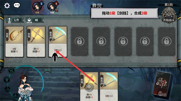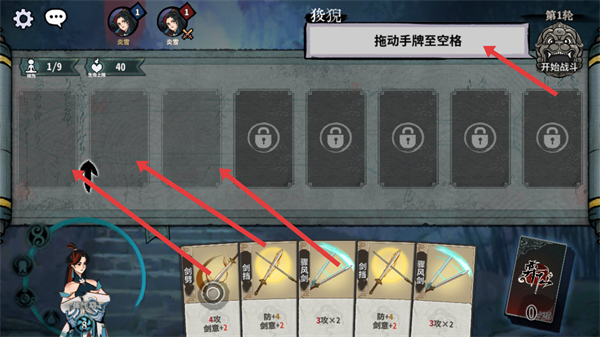 2、戰(zhàn)斗時(shí)需拖動(dòng)手牌至空格,布置手牌陣容,合理搭配劍劈、劍擋、驟風(fēng)劍等卡牌,為戰(zhàn)斗做準(zhǔn)備。