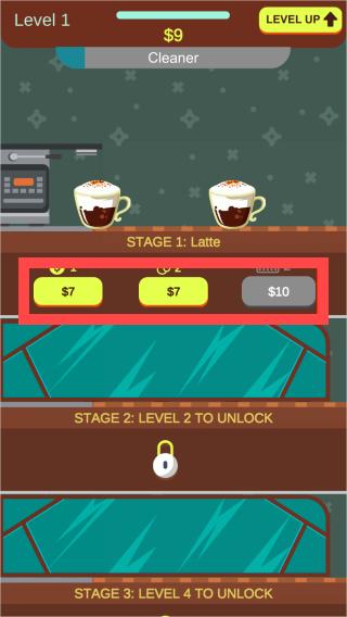 2、當前關卡是制作拿鐵,有不同金額選項,后續(xù)操作中金額有變化,可能代表不同選擇或獎勵數(shù)值。