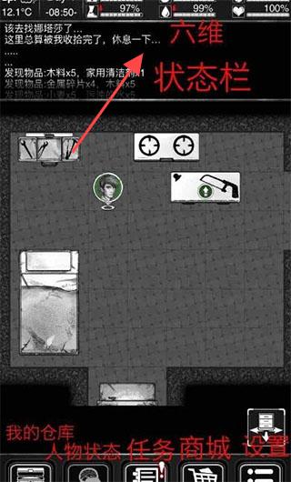 4、屬性狀態(tài)管理:時(shí)刻關(guān)注生命、體力、飽食等六維屬性,合理安排休息、進(jìn)食等行為維持良好狀態(tài)。