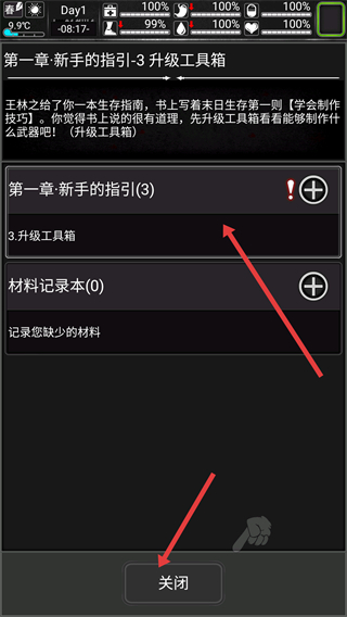 2、接到第一章新手的指引3升級工具箱任務(wù)后,可查看任務(wù)詳情,完成后點(diǎn)擊關(guān)閉按鈕,繼續(xù)游戲流程。