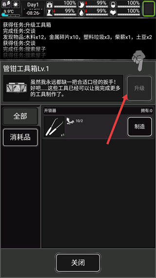 4、進(jìn)入管鉗工具箱界面,點(diǎn)擊升級按鈕,可升級工具箱,從而制作更多工具,助力末日生存。