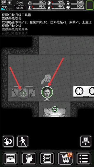 2、探索資源收集:攜帶制作的武器前往充滿喪尸的世界,探索建筑物,收集零散物品與可用資源。