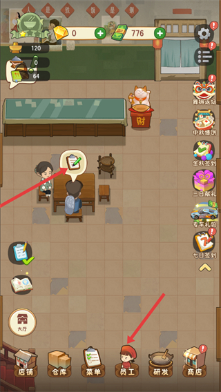 1、在大廳里,能看到顧客有需求時會出現(xiàn)相應標識,點擊下方員工按鈕,可進行員工相關管理操作,保障店鋪服務。