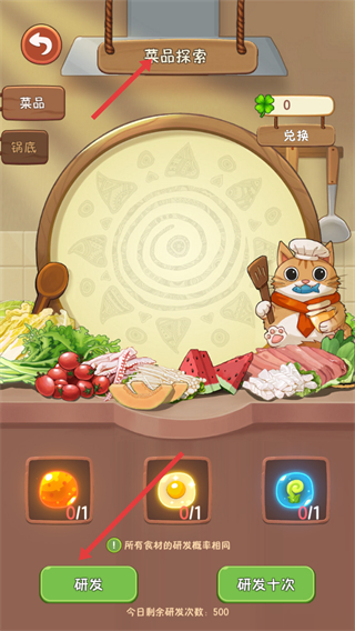 4、在菜品探索界面,可進行菜品研發(fā),能選擇研發(fā)一次或研發(fā)十次,利用食材嘗試解鎖新菜品,豐富店鋪菜單。