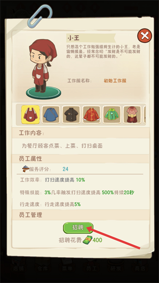 2、在員工界面,可查看員工小王的信息,包括工作服、工作內(nèi)容、屬性等,花費400金錢能招聘小王,助力店鋪運營。