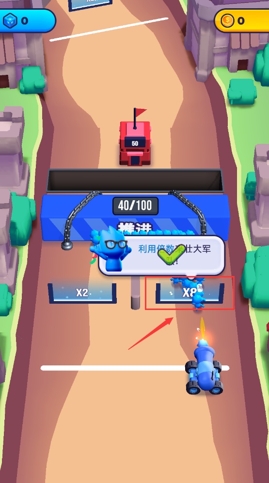 1、藍(lán)色小人可與敵方小人交戰(zhàn),通過數(shù)量優(yōu)勢擊敗敵方,同時利用倍增道具如X8等增加己方數(shù)量。