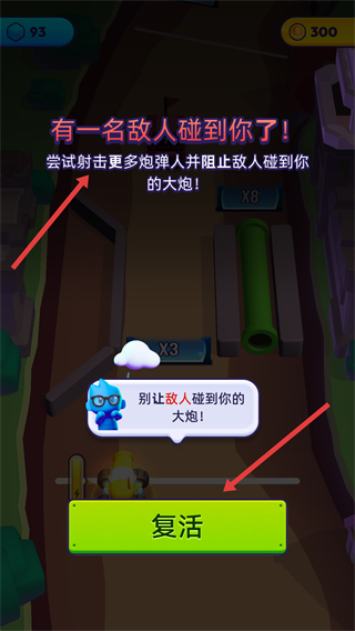 2、若敵人碰到大炮則游戲失敗,可點擊復(fù)活按鈕繼續(xù)游戲,需射擊更多炮彈阻止敵人靠近大炮。