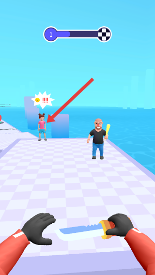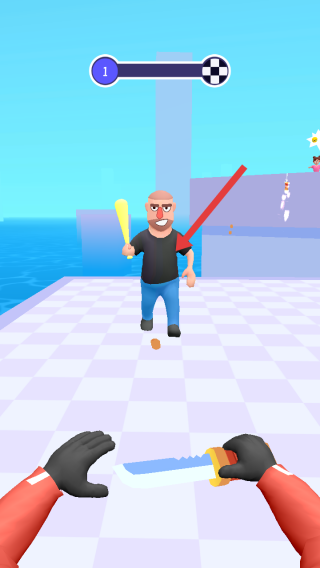 1、游戲開(kāi)始,海邊平臺(tái)場(chǎng)景,遇到手持黃棒球棒的人物,需操控角色,利用手中的刀,應(yīng)對(duì)與該人物的互動(dòng),開(kāi)啟冒險(xiǎn)。