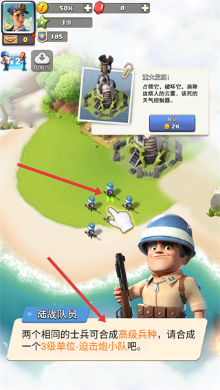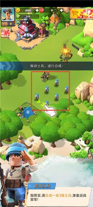 4、可合成士兵,兩個(gè)相同的士兵可合成高級(jí)兵種,如合成3級(jí)單位迫擊炮小隊(duì),擴(kuò)充兵隊(duì)實(shí)力,參與戰(zhàn)斗。