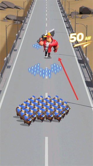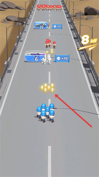 1、操控兵隊(duì)發(fā)射子彈攻擊前方敵人,擊敗敵人可提升kill數(shù),同時(shí)可獲取增益道具,增強(qiáng)兵隊(duì)?wèi)?zhàn)力。