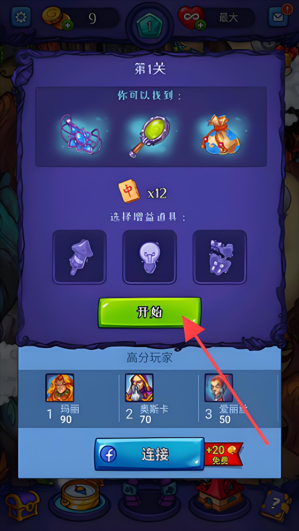 1、告知玩家可以找到的物品,有12張卡片,下方提供三種增益道具供選擇,點(diǎn)擊綠色開始按鈕進(jìn)入關(guān)卡。