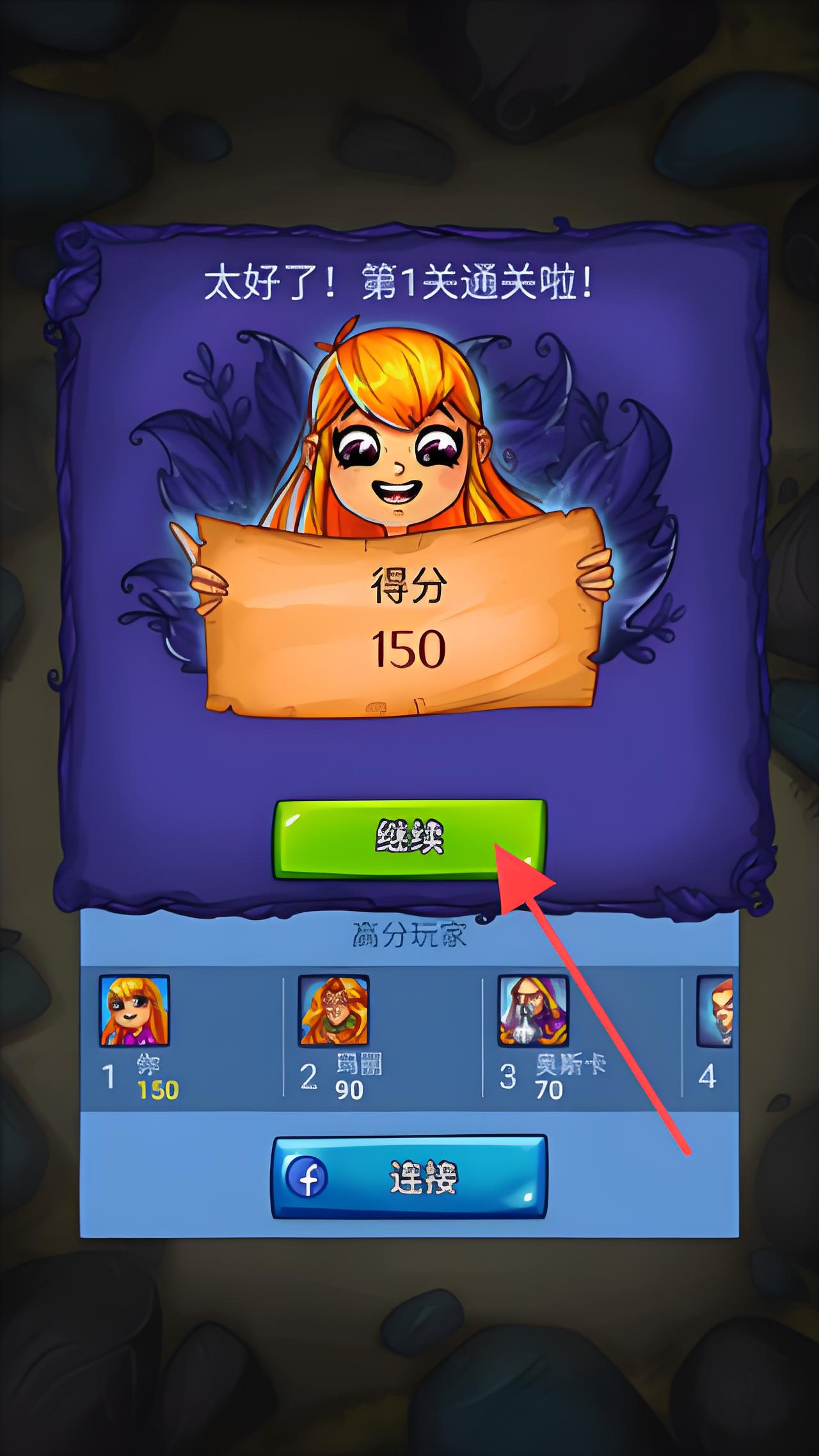 3、完成關(guān)卡任務(wù)后,顯示玩家得分150,點(diǎn)擊綠色繼續(xù)按鈕可進(jìn)入下一關(guān),同時(shí)展示了高分玩家排名情況。