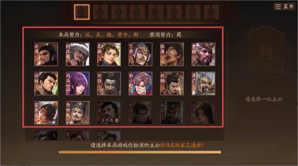 1、進(jìn)入游戲后開始對(duì)局,主公為玩家扮演的角色,每位玩家都需要從自己可以使用的主公中選擇一位。