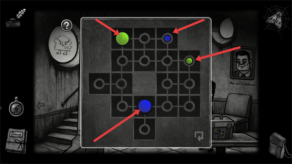 3、會(huì)出現(xiàn)解謎關(guān)卡,如帶有不同顏色圓點(diǎn)的棋盤,通過(guò)移動(dòng)圓點(diǎn)解開謎題,推進(jìn)游戲進(jìn)度。