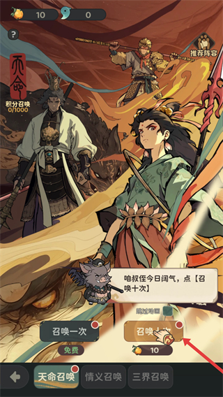 4、進(jìn)入天命召喚界面,可選擇召喚一次或召喚十次,消耗資源進(jìn)行召喚,獲取新的英雄或道具,增強(qiáng)隊(duì)伍實(shí)力。