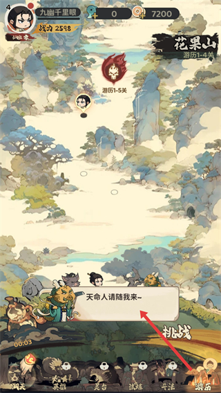 1、在花果山場(chǎng)景,點(diǎn)擊挑戰(zhàn)按鈕,跟隨天命人推進(jìn)游歷關(guān)卡,提升戰(zhàn)力,探索西游世界的不同場(chǎng)景。