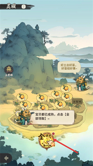 3、在靈圃里,作物成熟后點(diǎn)擊全部領(lǐng)取,收獲種植成果,利用這些資源提升角色或解鎖新功能,推進(jìn)游戲發(fā)展。