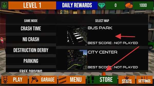 1、選擇地圖模式:點(diǎn)擊play進(jìn)入游戲,從多樣地圖中選擇場(chǎng)景,根據(jù)模式需求如碰撞時(shí)間、比賽制定駕駛策略。