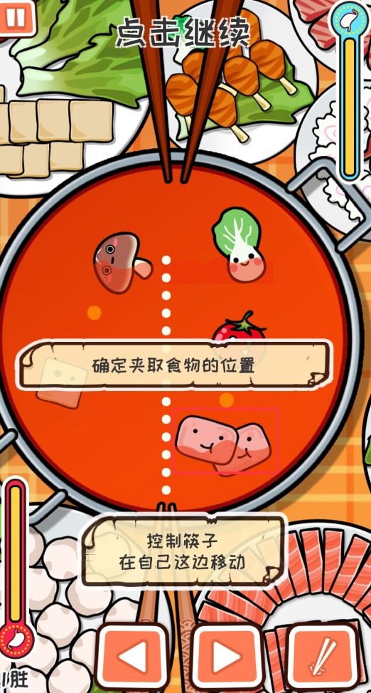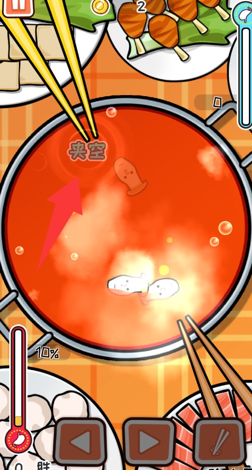 2、滑動屏幕操控筷子,瞄準漂浮的肥牛、蝦滑等美味食材,看準時機快速夾取。