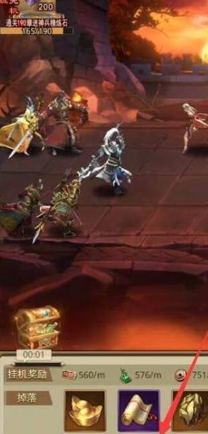 2、玩家操控角色戰(zhàn)斗,底部有掛機(jī)獎(jiǎng)勵(lì)顯示,還有掉落物品欄,展示戰(zhàn)斗中可獲得的道具,如金幣、書卷等,畫面緊張刺激,突顯戰(zhàn)斗實(shí)時(shí)性。
