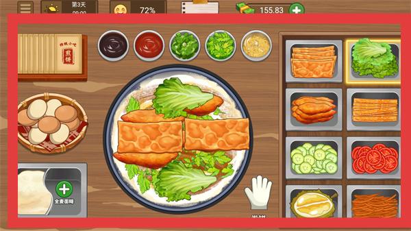 1、接單制作流程:點(diǎn)擊開始擺攤后,根據(jù)顧客提出的煎餅要求,依次選擇面餅、配料、醬料等食材,精準(zhǔn)搭配完成制作。
