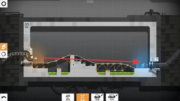 2、第二關(guān)斜坡這一關(guān)用到了三角形穩(wěn)定結(jié)構(gòu),先鋪設(shè)上一層橋面,然后點擊橋面進(jìn)行硬化,在橋面的下方,搭設(shè)三角形結(jié)構(gòu)進(jìn)行支撐,即可通關(guān)。