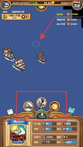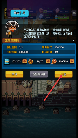 4、出航前管理艦隊,補充水、糧等物資,點擊出航按鈕,派遣艦隊出航,開展貿(mào)易或探險。