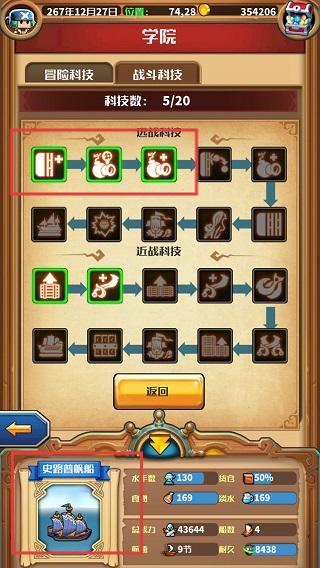 3、在學(xué)院界面有冒險科技戰(zhàn)斗科技等不同科技樹,玩家消耗科技點數(shù)如5、20研發(fā)科技,從遠(yuǎn)戰(zhàn)、近戰(zhàn)等方面提升艦隊能力。