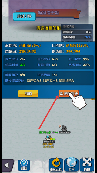 1、選擇貿(mào)易目的地如薩瓦埃,查看貿(mào)易品、供需量等信息,點擊選擇目的地,開展遠(yuǎn)洋貿(mào)易。