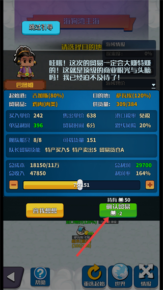 2、到達(dá)目的地后點擊確認(rèn)貿(mào)易,完成貿(mào)易獲取收益,查看總收益、總利潤等數(shù)據(jù),發(fā)展貿(mào)易經(jīng)濟(jì)。