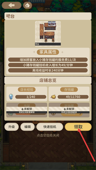 4、在吧臺(tái)界面可查看家具屬性和店鋪總覽,點(diǎn)擊領(lǐng)取按鈕獲取相關(guān)收益,助力咖啡屋的經(jīng)營(yíng)發(fā)展。