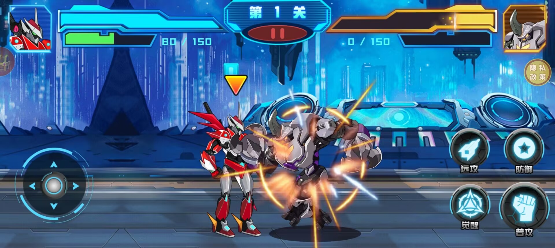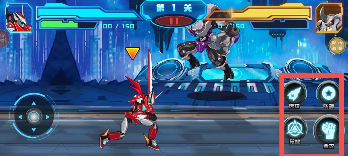 1、進(jìn)入機(jī)甲戰(zhàn)斗關(guān)卡,操控左側(cè)虛擬搖桿移動(dòng)機(jī)甲,調(diào)整站位,點(diǎn)擊右側(cè)普攻按鈕,執(zhí)行基礎(chǔ)攻擊試探敵方。