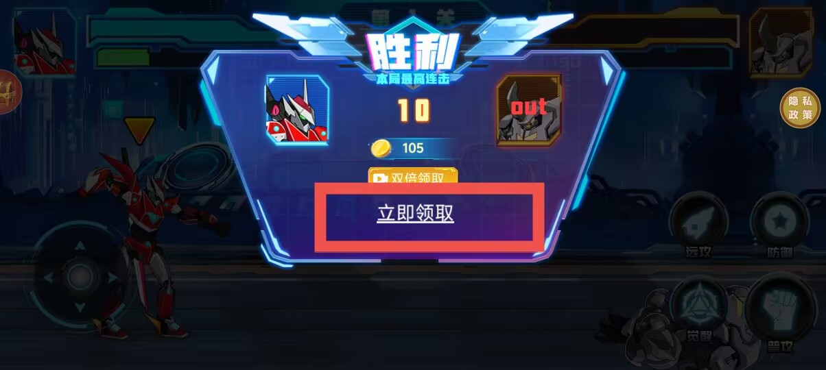 2、觀察敵方機(jī)甲攻擊節(jié)奏,當(dāng)敵方釋放技能前搖時(shí),迅速點(diǎn)擊右側(cè)防御按鈕,觸發(fā)格擋動(dòng)作,減免所受傷害。