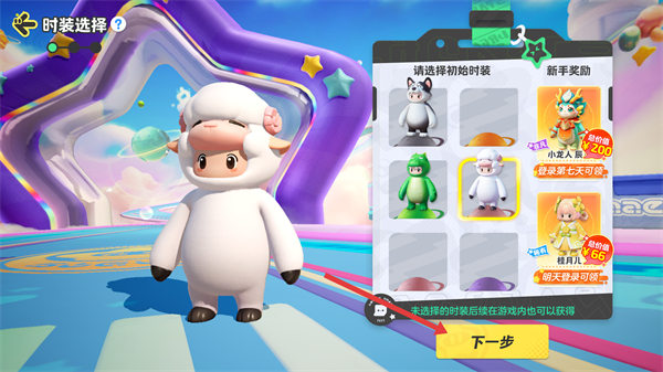 3、然后可進行時裝選擇,有多種初始時裝可供挑選,選好后還能獲得新手獎勵,讓角色更具特色。