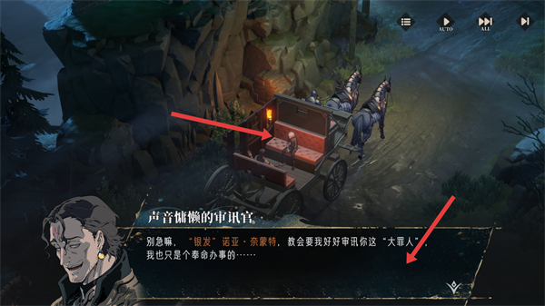 3、能看到審訊場景,審訊官和銀發(fā)諾亞奈蒙特在馬車上對話,講述教會要審訊大罪人的事,沉浸劇情氛圍。