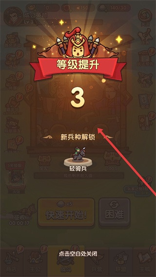1、等級(jí)提升時(shí)可解鎖新兵種,如輕騎兵,提升等級(jí)擴(kuò)充兵種,增強(qiáng)軍隊(duì)?wèi)?zhàn)力,豐富游戲玩法。