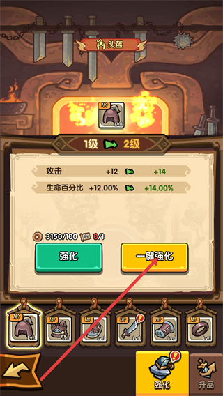 3、在強(qiáng)化界面可對(duì)頭盔等裝備進(jìn)行強(qiáng)化,選擇一鍵強(qiáng)化提升裝備屬性,增加攻擊和生命百分比。