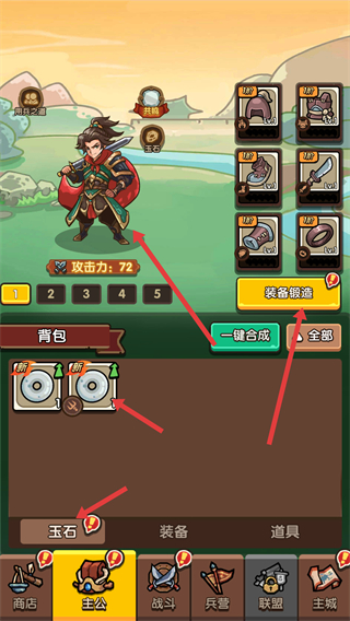 2、在主公界面可裝備銀酒等裝備,也可一鍵合成裝備,提升主公攻擊力,增強(qiáng)角色實(shí)力。