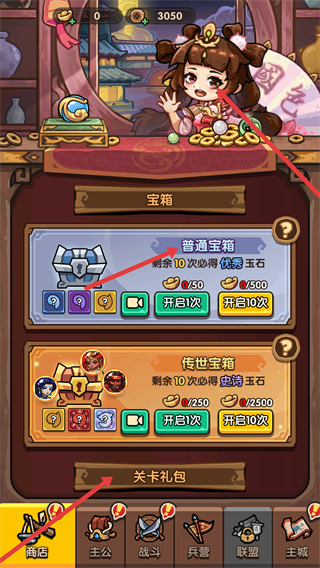 4、在商店可開啟普通寶箱、傳世寶箱等,獲取玉石等獎(jiǎng)勵(lì),還可查看關(guān)卡禮包,獲取額外資源。