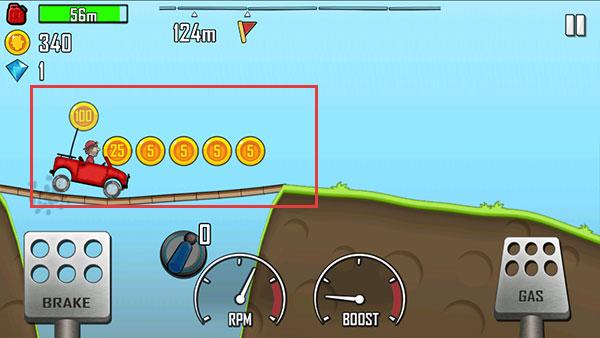 3、行駛時注意收集空中金幣,通過點擊油門、剎車調整車輛位置,獲取金幣,積累資源,推進關卡距離,完成等級1挑戰(zhàn),解鎖后續(xù)內容。