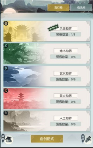 2、無極仙途這個界面,可以看到金木水火土五個屬性的圖譜,想要自創(chuàng)招式的第一步就是先領(lǐng)悟這些圖譜。