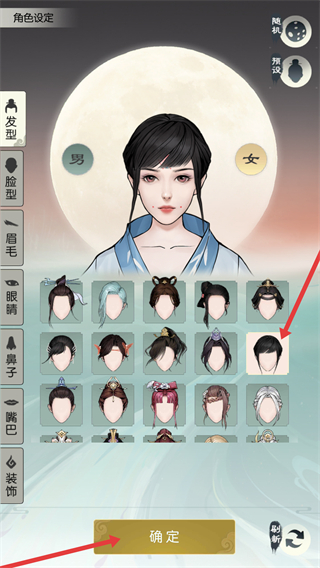 2、在角色設(shè)定界面可自定義發(fā)型等外觀,選好后點擊確定,完成角色創(chuàng)建,進入修仙世界。