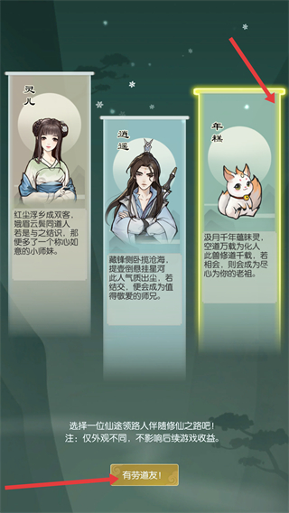 4、可選擇年糕等仙途陪伴人,不同陪伴人有不同故事,選擇后開啟有勞蕩寇任務(wù),推進修仙劇情。